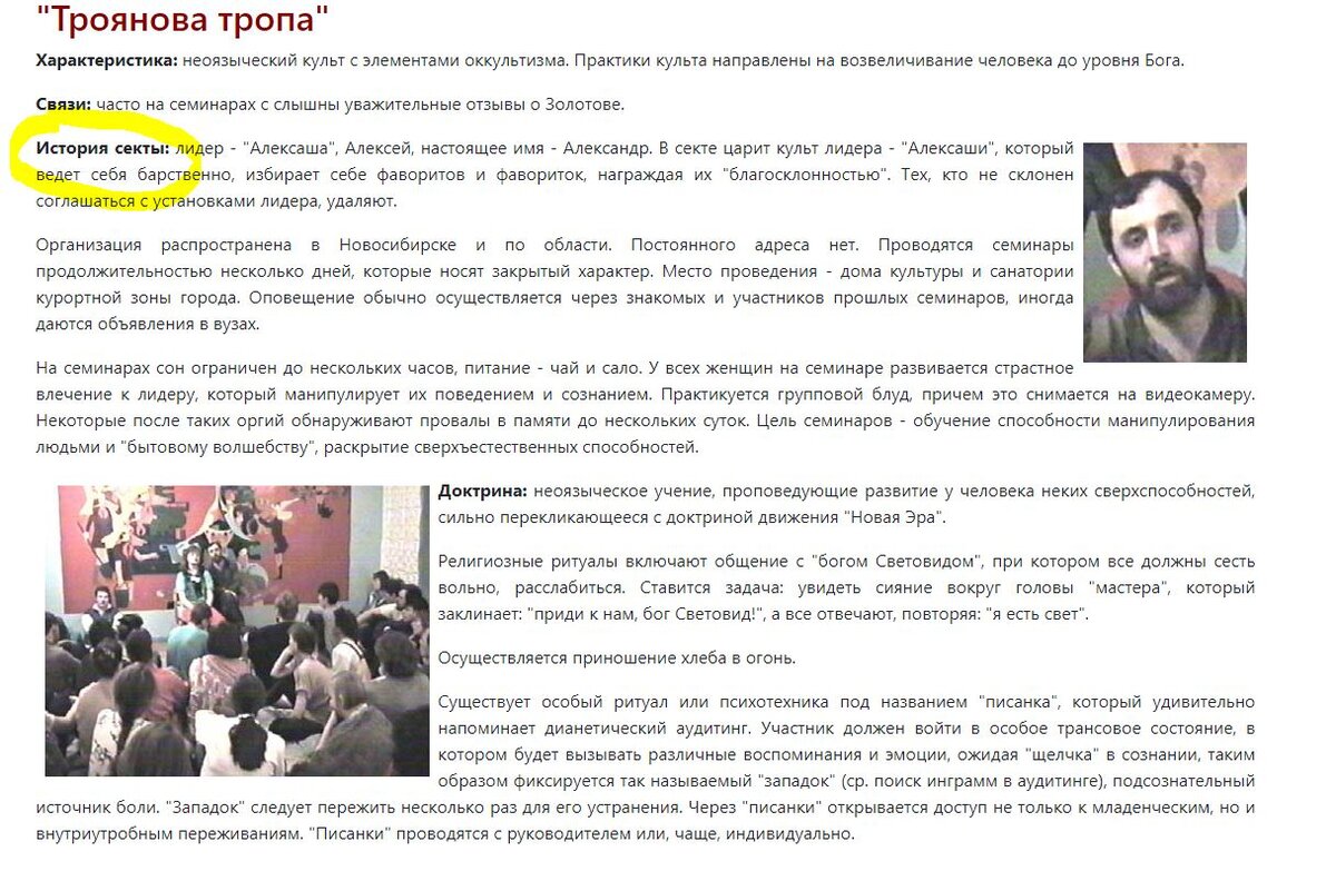 Его в простонародье знают, как САНЫЧА, того самого человека, что крестом бесконтактно укладывал людей, да бил мужиков и женщин, за что был привлечен к ответственности. Но он же, еще и возглавлял тоталитарную и деструктивную секту – «Тропа Трояна», о которой легко прочитать информацию в интернете.