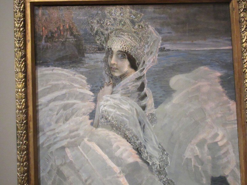 На этой стене представлены вариации "Царевны-лебеди". Рядом мои любимые незавершенные "33 богатыря", любимые за экспрессионизм, которые не на репродукции оказались очень крупным панно, а не крохотным этюдом.