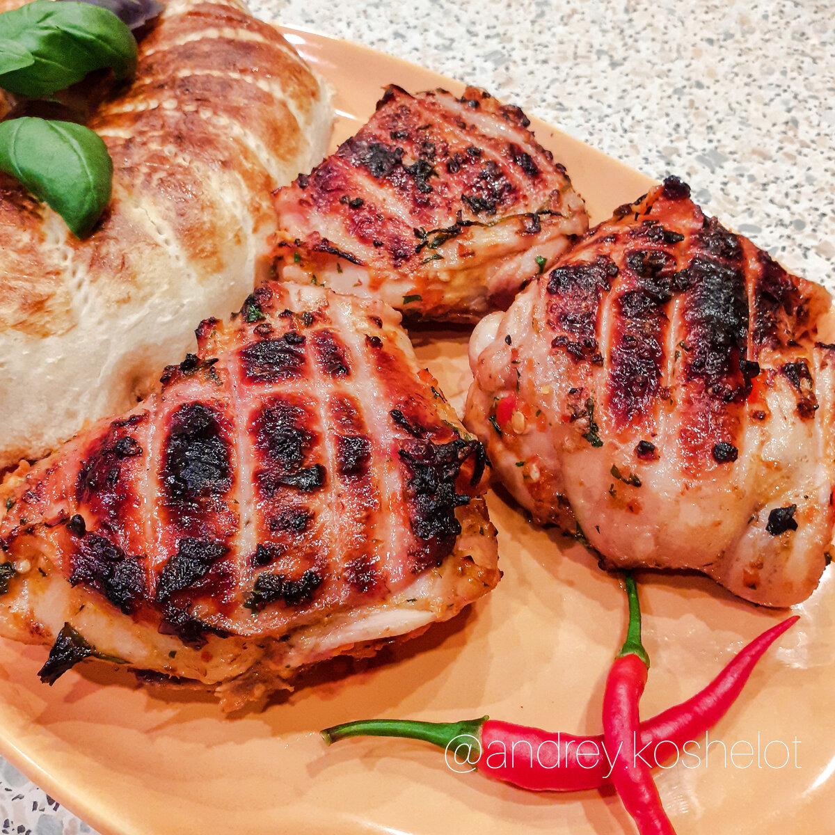 Выкладываем на решетку курицу, на ней готовить такой шашлык конечно удобнее. Жарим. Главное, как обычно: хорошо подготовленные угли, вовремя переворачивать, и не пересушить жгучую птичку)