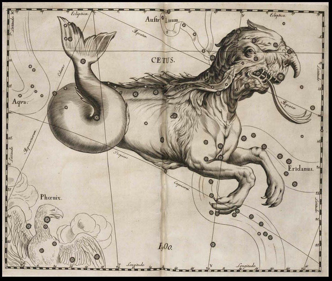 Что же было дальше? Дальше всё было по классике – герой Персей влюбился в прекрасную Андромеду и с помощью головы Медузы (которая могла взглядом превращать всё живое в камень) превратил Цетуса в скалу. Потом само собой сыграли весёлую и шумную свадьбу, а как же без этого... «И жили они долго и счастливо». Однако миф о Персее древнегреческим астрономам почему-то особенно полюбился. Иначе нельзя объяснить тот факт, что абсолютно все главные герои этого мифа получили по собственному созвездию: Кассиопея, Цефей, Андромеда, Персей и Цетус. И Ян Гевелий в своей книге рисовал не кита – он именно Цетуса рисовал! Потому и получилось у него жутковатое чудо-юдо, на кита совершенно непохожее.