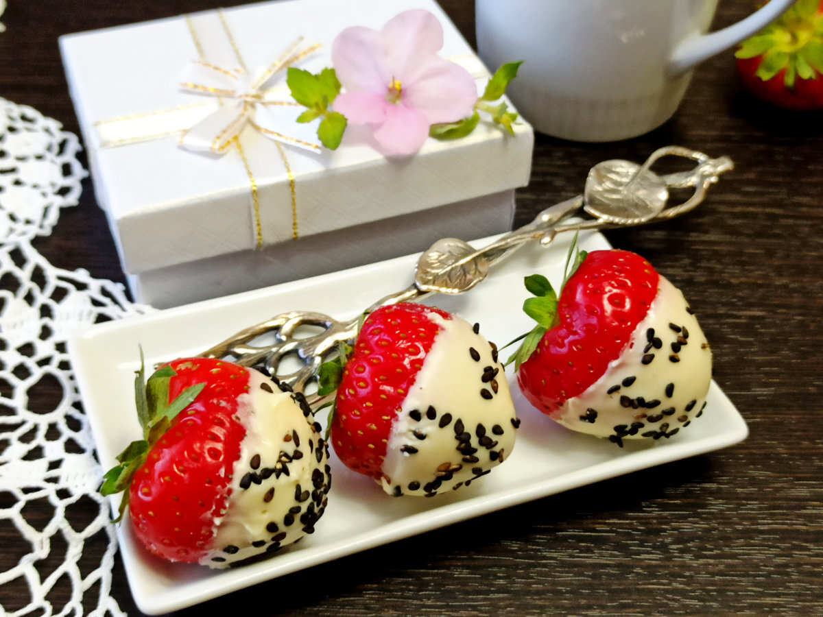 Этот красивый и лёгкий десерт из клубники и шоколада приготовить не так уж и сложно. Зато на девичьих посиделках или на романтическом ужине вы порадуете своих гостей, подав его к бокалу шампанского. Ккал: 156.7, время приготовления: 1 ч. #Десерты и выпечка #Европейская #Для детей #Праздничное блюдо #Просто приготовить #Шоколад Ингредиенты Приготовление: 1. Подготовить ингредиенты для десерта. Клубнику помыть и обсушить, чашелистики не обрывать. Шоколад можно взять молочный или темный. Тогда вместо черного кунжута используйте белый. 2. Шоколад поломать на небольшие кусочки и растопить. Можно это сделать в микроволновке или на водяной бане. Для удобства возьмите маленькую и глубокую ёмкость типа розетки для варенья. 3. Взяв клубнику за чашелистик, аккуратно опустить в растопленный шоколад. Пока он не застыл, посыпать черным кунжутом. 4. Ягоды разложить на дощечке на пергамент и поставить в холодильник для охлаждения на 20-30 минут. 5. Вкусный десерт готов. Приятного аппетита! Всем