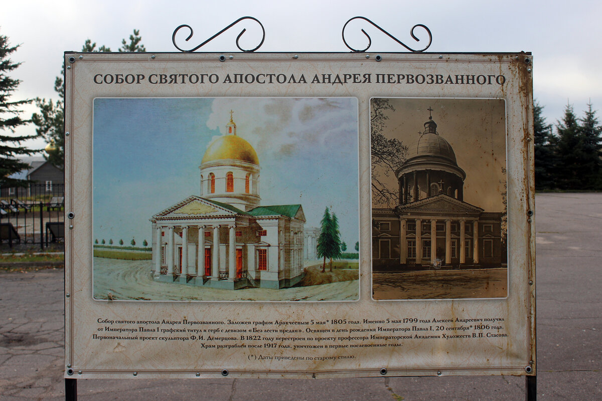 На фотографии выше я показал церковь Андрея Первозванного, которая была разрушена в период Великой Отечественной войны, как и всё имение Аракчеева. Граф был похоронен при храме. Так выглядело надгробие.