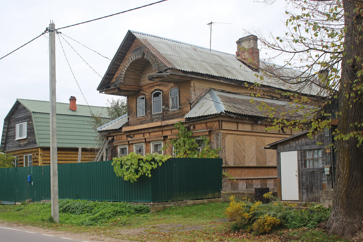 В деревню Лезье, которая находится в Ленинградской области, как в отдельный населённый пункт в плане путешествия я бы никогда не поехал. Всё-таки там нет никаких стандартных достопримечательностей, а бродить наобум я не особо люблю. Но поскольку я выбрался в Сологубовку осмотреть немецкое мемориальное кладбище и церковь, то посетил заодно и Лезье. Сразу покажу самый красивый дом населённого пункта. Первый ракурс был выше. Вот второй. Резной красавец! Только забор мешает... Здание было построено в 19 веке и очень даже неплохо сохранилось до наших дней. Если отвлечься от архитектуры, то в деревне можно посмотреть старую булыжную дорогу. И посмотреть, и прогуляться по ней. Продолжим осматривать архитектуру. Второй по красоте... такой вот дом с резными наличниками. Хотя стоит ли делить здания на вторые и третьи... У этого строения наличники не хуже. Стиль такой же. Но рисунок иной. Может быть и делал один мастер. Чудесный дом в осеннем наряде. С этого ракурса хорошо виден массивный декор п