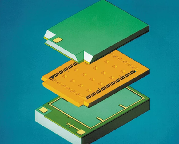 Весь кристалл акселерометра размером 3,05•3,05 мм занят глав- ным образом схемами формирования сигнала, которые окружают миниатюрный датчик ускорения размером 1•1 мм, расположенньгй в его центре. Датчик ггредставляет собой дифференциальную конденсаторную структуру с воздушным диэлектриком, обкладки которого вырезаны (вытравлены) из плоского куска поликремниевой пленки толщиной 2 мкм. Неподвижные обкладки этого конденсатора представляют со- бой простые консольные стержни, расположенные на высоте 1 мкм от поверхности кристалла в воздухе на поликремниевых столбиках- анкерах, приваренных к кристаллу на молекулярном уровне (рис. 37). Инерционная масса датчика ускорения при изменении скорости перемещения кристалла смещается относительно остальной части кристалла. Ее пальцеобразные выступы образуют подвижную об- кладку конденсатора переменной емкости. С каждого конца эта структура опирается на столбики-анкеры, аналогичные по кон- струкции держателям неподвижных обкладок. Растяжки по концам