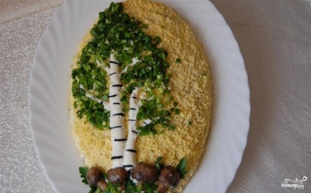 Посыпаем натертым твердым сыром, тонкий слой майонеза. Начинаем оформлять салат. По центру насыпаем тертым желток куриного яйца, вокруг белок. Ствол березки делаем из струйки майонеза через кондитерский шприц. Листву березки можно выложить измельченным промытым пером зеленого лука. Полосочки на стволе березки можно сделать из черных маслин или кусочка черного хлеба. Салат готов. Даем ему пропитаться в холодильнике и подаем к столу. Приятного аппетита!