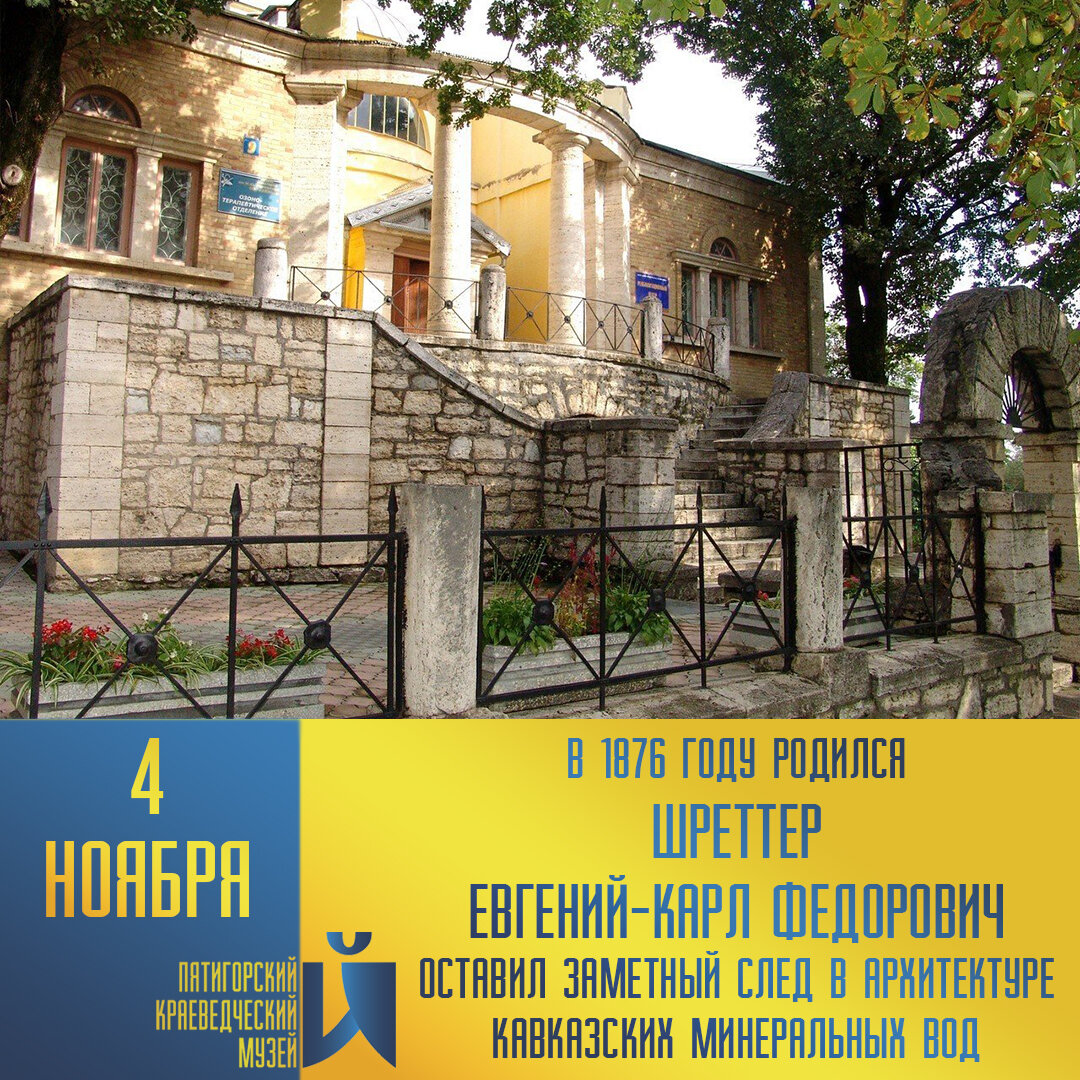 Евгений-Карл Федорович Шреттер родился в г. Кременчуге Полтавской губернии в семье австрийского подданного, купца 1-й гильдии Федора Шреттера. Образование получил в Ровенском реальном училище, затем продолжил учебу в училище при Академии художеств в Петербурге и после окончания в 1904 г. получил звание художника-архитектора. Работал в Екатеринославе, Ялте и Петербурге, участвовал в ряде конкурсов. Основным направлением его деятельности стало проектирование общественных и частных построек в бурно развивающихся в начале ХХ века курортах России и Европы. Е.Ф. Шреттер оставил заметный след и в архитектуре Кавказских Минеральных Вод. В 1911 г. был утвержден для постройки его проект Грязелечебницы в г. Ессентуки, которая по праву считается одним из самых живописных зданий Ессентукского курорта. Используя наработанный опыт, в 1912–1913 гг. он руководит строительством разработанной по проекту зодчего М.М. Перетятковича Грязелечебницы и в г. Пятигорске. Помимо крупных лечебных зданий Е.Ф. Шретт