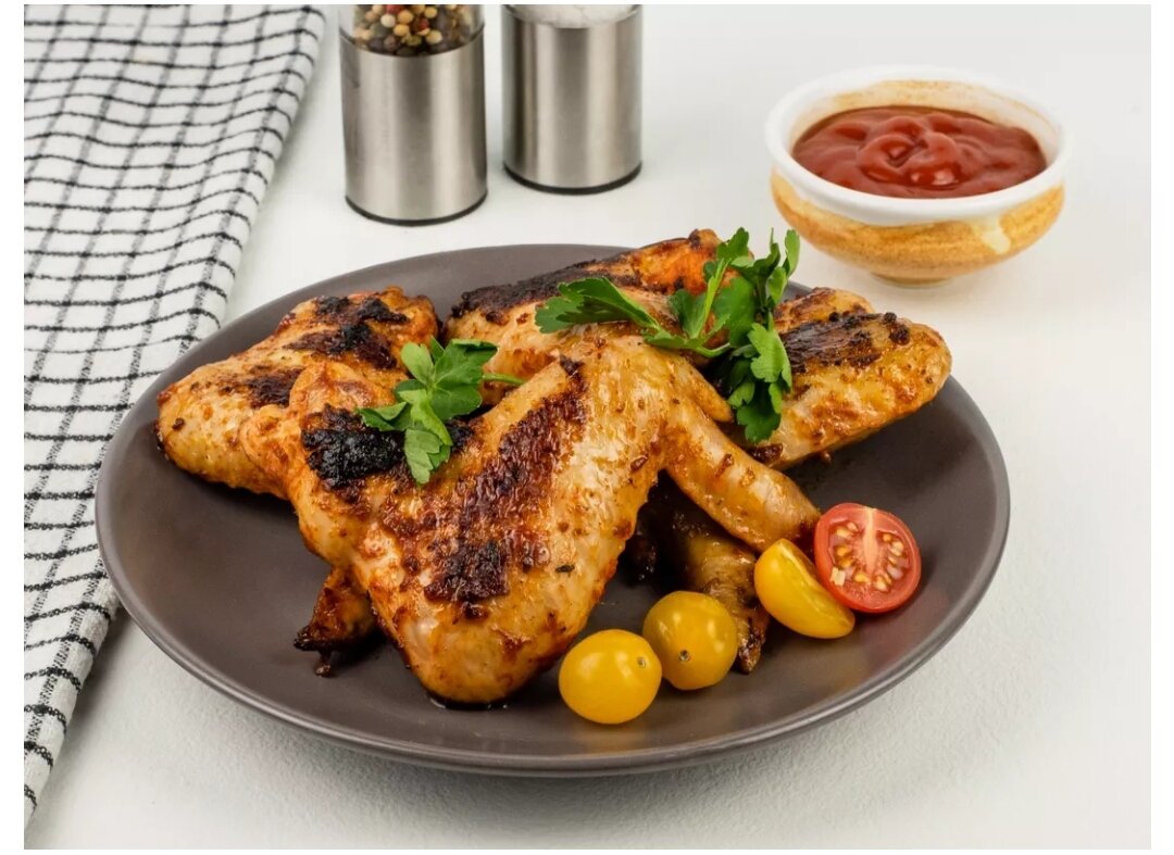 Ароматные куриные крылышки — блюдо для настоящих ценителей. Сочное и насыщенное, оно подойдет к любому гарниру на вашем столе. Крылышки можно оформить в красивую подачу как порционно, так и на общем блюде. Горячие крылышки с румяной, аппетитной корочкой можно подать с овощами или соусами. Куриные крылья просты в приготовлении и с легкостью сочетаются с любым видом пряностей на ваш выбор. Калорийность 181,25 ккал Белки 17,41 г Жиры 11,65 г Углеводы 2,2 г Пищевая ценность на 100 г. Калорийность рассчитана для сырых продуктов. Будет готово через 30 минут Время на кухне 20 минут Содержит аллерген Нет Кухня Русская ПРОДУКТЫ ДЛЯ БЛЮДА Порции 4 Куриные крылышки 500 г Томатная паста 50 г Растительное масло 1 ч. л. = 5 г Лимонный сок 1 ч. л. = 5 г Специи = 10 г Соль = по вкусу Черный перец молотый = по вкусу ДЛЯ УКРАШЕНИЯ Свежая зелень = 10 г Помидоры черри 3 шт. = 60 г СДЕЛАТЬ РАЗНООБРАЗНЕЕ Томатную пасту можно заменить кетчупом. Из специй возьмите карри, паприку или куркумы. ПОЭТАПНОЕ ПР