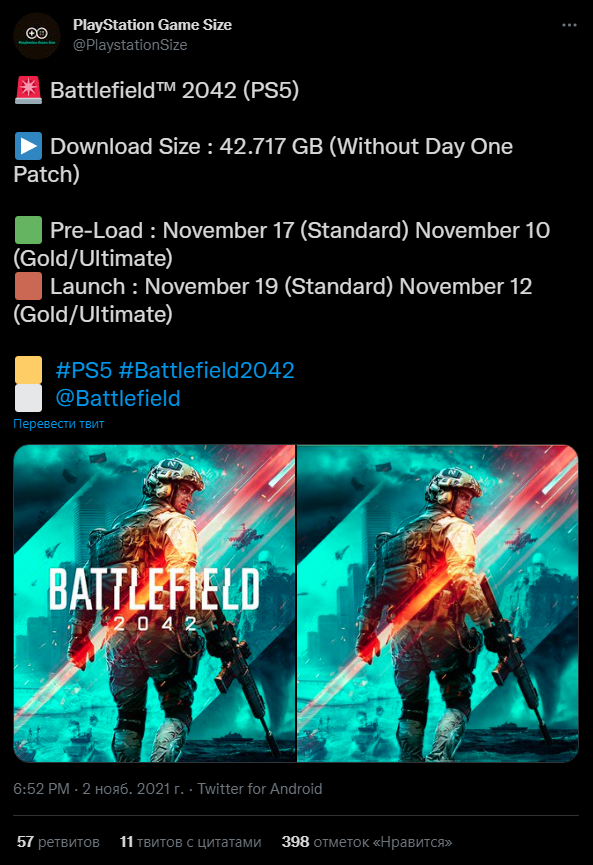 Размер файла Battlefield 2042 на PS5 был обнаружен, и он на удивление меньше, чем ожидалось. Согласно аккаунту @PlayStationSize в Твиттере, Battlefield 2042 предположительно займет 42,389 ГБ в США и 42,717 ГБ в ЕС. Этот размер файла также, очевидно, без патча первого дня, где он, как ожидается, вырастет. Battlefield 2042 должен выйти 19 ноября. Если вы предварительно заказали версии Gold или Ultimate, то вы можете начать игру 12 ноября. То же самое касается предварительной загрузки Battlefield 2042, которая начинается 17 ноября (стандартная версия) или 10 ноября (золотая/ полная версия). Футуристический шутер от первого лица также будет доступен на PS5, PS4, Xbox Series X / S, Xbox One и ПК. Если вам интересно, что вам понадобится для игры на ПК, хорошие новости: требования Battlefield 2042 для ПК уже опубликованы. EA рекомендовала игрокам иметь графическую карту NVIDIA Geforce RTX 3060 или AMD Radeon RX 6600 XT, 16 ГБ ОЗУ и 100 ГБ SSD, однако есть также вариант с минимальными характер