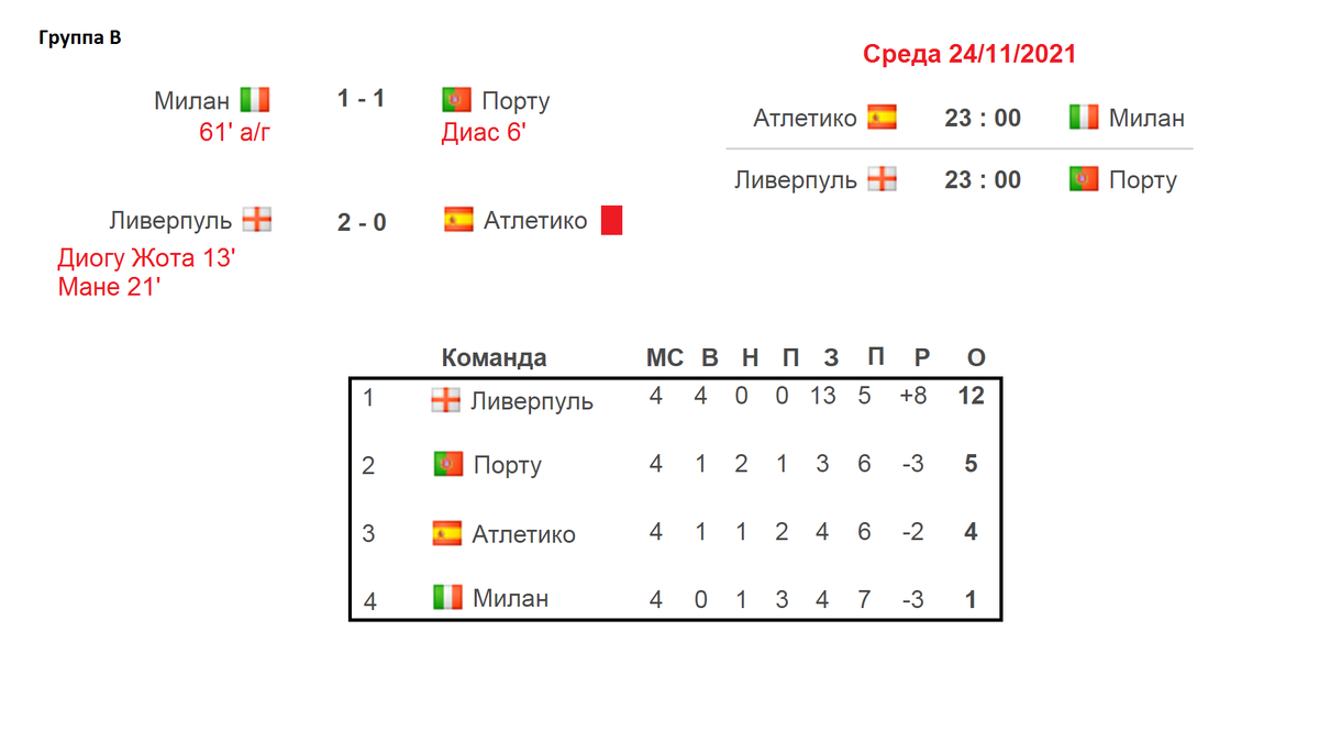 Здравствуйте, уважаемые любители Лиги Чемпионов. Очередной игровой день мог подарить ещё двух участников стадии плей-офф. Получилось ли у них? Вечер среды начался с ничьи между Миланом и Порту (1:1). Это был 11-й очный матч: 4 победы у итальянцев, 3 победы у португальцев, и четвертый раз зафиксирован ничейный исход. 24-летний колумбиец Луис Диас отметился 11-м голом в сезоне во всех турнирах. Милан добыл первое очко в Лиге Чемпионов с 2014 года, сейчас у команды три победы и ничья. Ливерпуль в большинстве обыграл Атлетико и обеспечил себе место в 1/8 финала (2:0). В игре было отменено 2 мяча. В истории личных противостояний испанцы выиграли 4 раза, англичане – 3, и три раза была ничья. Выделим 23-летнего британского защитника Александра – Арнольда, который отдал в этой игре 2 передачи. Команда Клоппа не проигрывает 3 месяца или 20 матчей подряд. Таблица. Ливерпуль набрал 12 очков из 12. Команда не только вышла в плей-офф, но и досрочно выиграла группу. Остальные команды поборются за