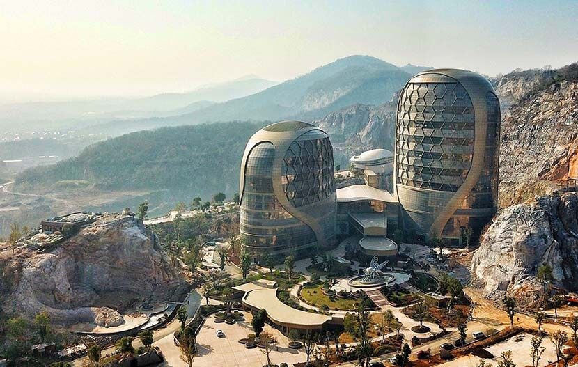 Великолепный отель открылся в конце 2019 года в Нанкине, столице восточной провинции Китая. Отель стилизован под пчелиные соты и назван "Honeycomb", в честь мёда, который специализируется в этой области Китая. Отель с более чем 500 номерами был построен рядом со скалой в горном районе Лаошань, что делает его идеальным местом для любителей острых ощущений, таких как скалолазание и прыжки с тарзанки. Он является частью тематического парка "Dragon Valley". Отель состоит из очень необычно выглядящей 12-этажной башни и 20-этажной башни соединенные между собой. Среди наиболее впечатляющих особенностей на территории отеля - две гигантские львиные головы, высеченные в скале с обеих сторон. При высоте более 30 метров они являются потрясающим дополнением к отелю. 100 граверам потребовалось шесть месяцев, чтобы высечь их в скале.