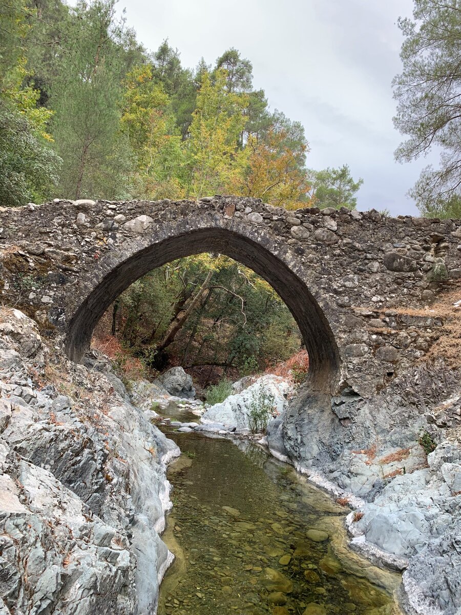 Почему мистический, спросите Вы? Ответ будет простым: Мы его долгое время не могли найти. Нашли, а оказался он не Elias. И вот, совершенно случайно, мы обнаружили этот Венецианский мост. Приехали мы к самому большому мосту Челефос прогуляться вдоль реки. Нагулялись и решили найти пикниковое место. Полагаясь на навигатор, который показывал всего 15 км от этого места, мы воодушевленные скорой трапезой, двинулись в путь. И, если двигаться вдоль русла реки по дороге, она, петляя по ущелью, приведет вас к красавцу мосту ELIAS. Теперь мы понимаем, что это единственный верный путь. Дороги в этих местах достаточно опасны даже трассы. Я промолчу, про грунтовки. Везде не только знаки камнипада, но и вся дорога усыпана камнями. Так что мы двигались предельно аккуратно. Итак, про мост: Высота этого моста 5,5 метра, длина примерно 15 метров. Он спрятан в лесистой чаще Пафоского леса, на крутом берегу реки Фини. Пейзажи этого места удивительны красивы. На Кипре “Золотая осень” есть! И она в этом ме