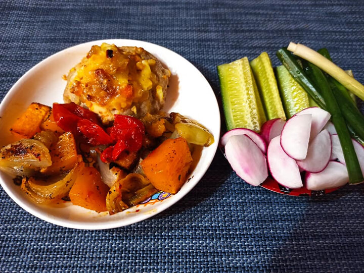 Котлета из домашней индейки под мааааленькой "шубкой" из вареного яйца, и запечённые овощи - тыква, перец, лук, помидоры.