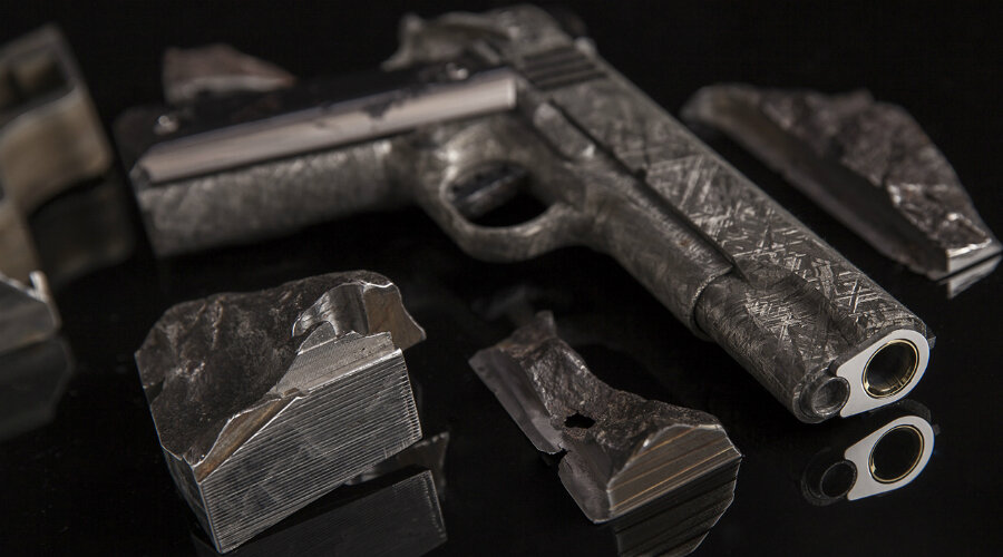 Специалисты американской компании по производству оружия "Cabot Guns" создали пистолеты из метеоритного металла, назвав их "Пистолетами Большого Взрыва". Ими стали два пистолета "Кольт" марки M1911. Достаточно сказать, что стоимость получившихся пистолетов — 4.5 миллиона долларов, что делает их непревзойденными хотя бы в плане цены. Сырьем для изготовления пистолета стал метеорит Гибеон, упавший в Намибии примерно 500 000 лет назад. Возраст самого метеорита примерно равен возрасту Земли – около 4,5 миллиарда лет. Стоит отметить, что компания "Cabot Guns", несмотря на свой юный пятилетний возраст, успела зарекомендовать себя, как производитель элитного оружия в стиле начала ХХ века. Так что материал сам по себе гораздо примечательнее и интереснее каких-нибудь банальных драгметаллов. При этом, оба "Кольта" были сделаны с сохранением кристаллической структуры метеорита. Самым простым способом была бы обычная выплавка - но оружейники пошли по трудному пути и выточили фрагменты пи
