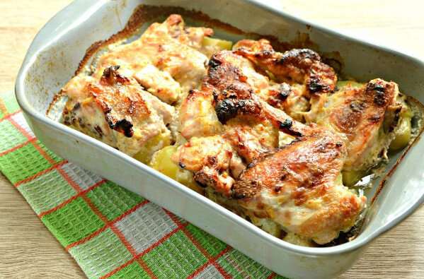 Курица с картошкой – простое по части приготовления блюдо для большой семьи. Продукты, используемые при приготовлении этого блюда, дают беспроигрышную комбинацию за счёт того, что они друг друга дополняют. Особенно хороша здесь сметана, в которой будет мариноваться курица, наполняясь нежностью, сочностью и ароматами. Нам понадобится: приготовление: Голени, промыть и сложить их в одну большую миску достаточной ёмкости. Туда же добавить приправы по вкусу, соль, сметану, а также чеснок. И, активно перемешиваем мясо в этой смеси. Размешивать нужно хорошо, чтобы все мясо как следует «извалялось» в маринаде. После этого можно положить ёмкость с мясом на ночь в холодильник или оставить в помещении на час-другой. Пока мясо готовится, подготавлеваем картошку. Её необходимо очистить от кожуры и нарезать в произвольной форме. Важное правило: форма должна быть такой, чтобы после приготовления кусочки картошки с легкостью накалывались на вилку, не убегали и не ломались пополам. Теперь ну