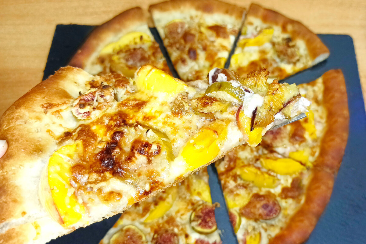 Недавно меня угостили домашними персиками. Наелись от пуза, стала думать, что бы такого из них приготовить. Благодаря этому на свет появился вкусный салат, а затем решила ещё поэкспериментировать и сделала пиццу, которую теперь так полюбили мои родные. Список ингредиентов и их количество в конце статьи. ПРИГОТОВЛЕНИЕ Тесто В муку добавляем воду и все остальные ингредиенты, замешиваем мягкое, не липнущее к рукам, тесто. Вода обязательно должна быть тёплой! Накрываем ёмкость с тестом пищевой плёнкой или пакетом и оставляем в тёплом месте на 30 минут. Тесто готово. Начинка Удаляем из персиков косточки и нарезаем дольками. Инжир нарезаем кольцами, а орех измельчаем в крупную крошку (я использовала для этого ступку и пестик). Сыр натираем на мелкую тёрку. Собираем пиццу Тесто делим на несколько частей – размер зависит от вашего противня и желания. Тонко раскатываем его, оставляя бортики по краям. Выкладываем персики, инжир, посыпаем орехами, сыром и отправляем в хорошо прогретую духовку. Вы