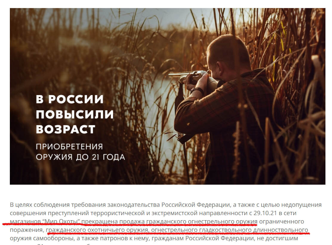 «В целях соблюдения требования законодательства Российской Федерации, а также с целью недопущения совершения преступлений террористической и экстремистской направленности с 29.10.21 в сети магазинов “Мир Охоты” прекращена продажа гражданского огнестрельного оружия ограниченного поражения, гражданского охотничьего оружия, огнестрельного гладкоствольного длинноствольного оружия самообороны, а также патронов к нему, гражданам Российской Федерации, не достигшим возраста 21 года на дату обращения».
