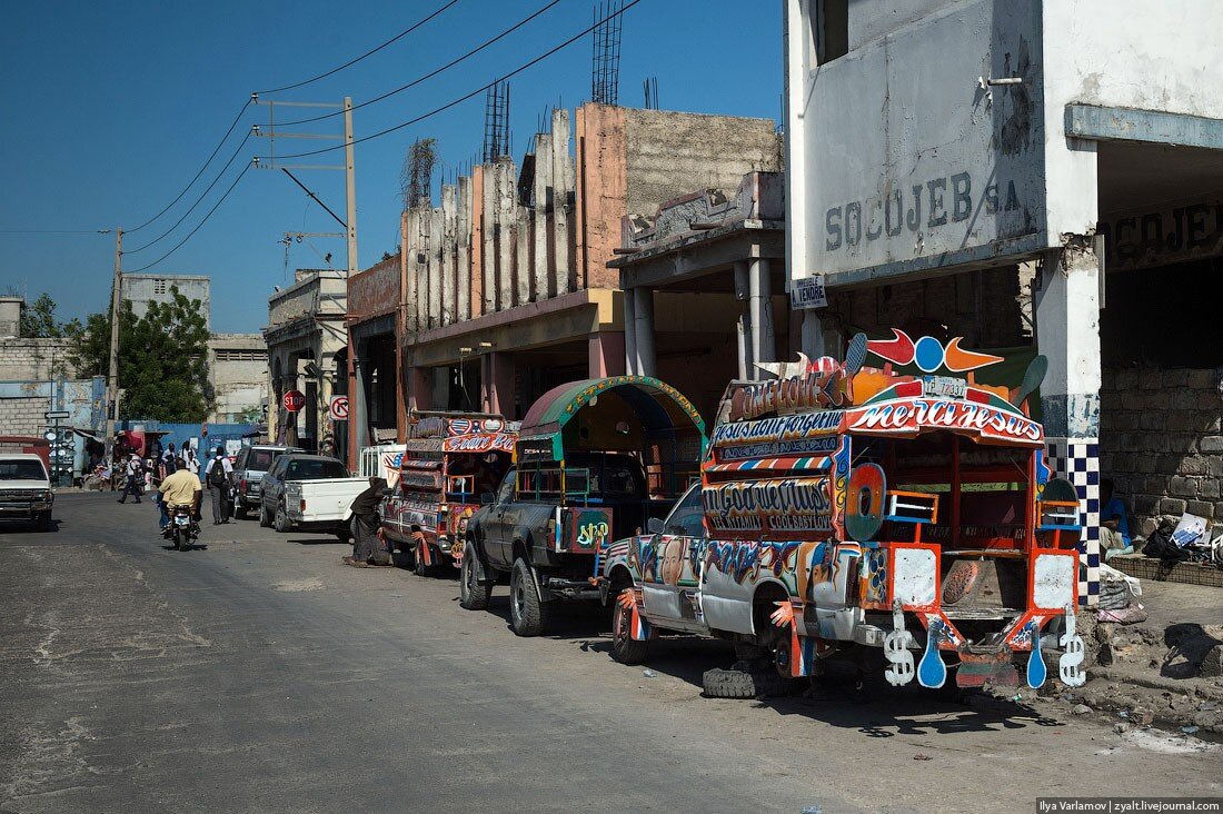Сегодня расскажу про транспорт в Порт-о-Пренсе, столице страны. Транспорт — единственная позитивная вещь, которая здесь есть. Самый популярный вид общественного транспорта — вот такие пикапы, переделанные в маршрутки. К старому пикапу приделывают крышу и две лавки. Проезд стоит 1 рубль ) На подножке бесплатно. Вход и выход прямо на ходу или светофорах. Народу в такие маршрутки набивается много, многие свисают с лавок прямо над дорогой. По возможности владельцы маршруток раскрашивают свои машины. Есть более вместительные варианты Дальше идут вот такие расписные автобусы. Чем пышнее и ярче декор, тем лучше. Серьезная машина. Или вот ) Спереди место для багажа Расписной грузовик Если есть деньги, то можно и на нормальном автобусе проехать, это удел богатых. Ходят такие между городами. На крыше ехать в два раза дешевле, но и опасно. Иногда такие пассажиры падают и разбиваются.