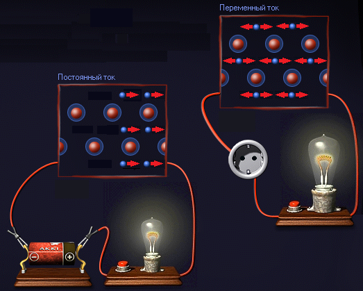 Такое колебательное движение воды – это аналог переменного тока. Колебания могут совершаться с различной интенсивностью и частотой, в соответствии с тем, какую интенсивность и частоту колебаний задаёт источник. Такой ток генерируется большинством генераторов, такой ток используется в бытовой электросети. На следующей картинке показано, как движутся электроны рядом с неподвижными ядрами атомов для постоянного и переменного тока. Заметим, что лампа в обоих случаях светится: