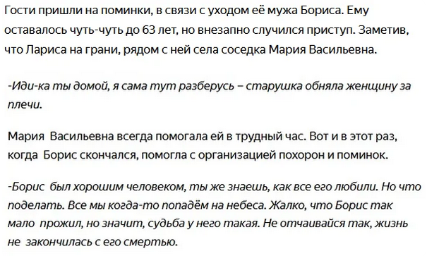 Лариса всё ещё не до конца понимала, что это происходит с ней. Она сидела и не обращала внимание на всё происходящее вокруг. Периодически к ней подходили люди, чтобы выразить слова сочувствия, но она просто кивала.