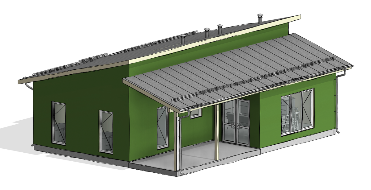 Дом, про который я сегодня расскажу, недавно уже был в наших соцсетях, но в каком-то неприглядном виде – на крышу упало большое дерево, так что всё внимание уделялось последствиям и повреждениям, а сам дом незаслуженно остался в тени. Строительство началось в летом 2021 года, 2 августа на объект заехала бригада бетонщиков и стартовала стройка фундамента УШП. Спустя 12 дней фундамент был готов и уже 17 августа на объект заехала бригада плотников, началось строительство каркаса. Через 10 дней дом выглядел так: Вид сверху: Двухуровневая крыша представляет из себя, фактически, две односкатные кровли. Трёхмерная модель выглядит так: Угол обеих крыш 16°: Строим в красивом месте, неподалёку Финский залив: Если посмотреть поближе, дом выглядит так: Кстати, прицеп на первой фотографии – это передвижной домик, в котором живут рабочие. Используем такие вместо бытовок, что намного удобнее и комфортнее, чем обычная бытовка. Разрез крыши выглядит так: Спустя ещё 5 дней стропильная система была