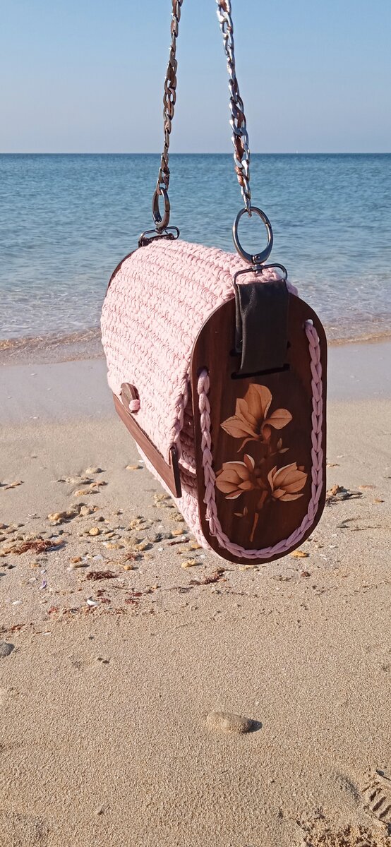 И она мне очень нравится! Деревянные боковины и передняя планка - это фанерные заготовки , которые сделаны в технике маркетри (мозаика шпоном ценных пород дерева) Мне всегда хотелось сделать "носимое" маркетри. Ведь мы знакомы с этой техникой исключительно из настенных панно периода СССР и как украшение предметов мебели. Поэтому я и решила придумать сумку, которая была бы и модной, и оригинальной. Саму сумку вязала моя мама из трикотажной пряжи. Я сначала долго сомневалась по поводу этой пряжи, ведь она относительно недавно появилась. И пряжа эта не нить, а бесшовная трикотажная лента. Сумка из такой нити прекрасно держит форму. И, как мне кажется, у мамы вышло очень хорошо. Цвет я выбрала пудрово-розовый. Он хорошо сочетается со шпоном палисандр, из которого сделан фон боковин. Для маркетри-боковин использованы ценные породы дерева: палисандр, биболо, лайсвуд, палдао. Здесь вы можете посмотреть процесс нанесения масла на боковины сумки И так как это мой первенец, то есть не