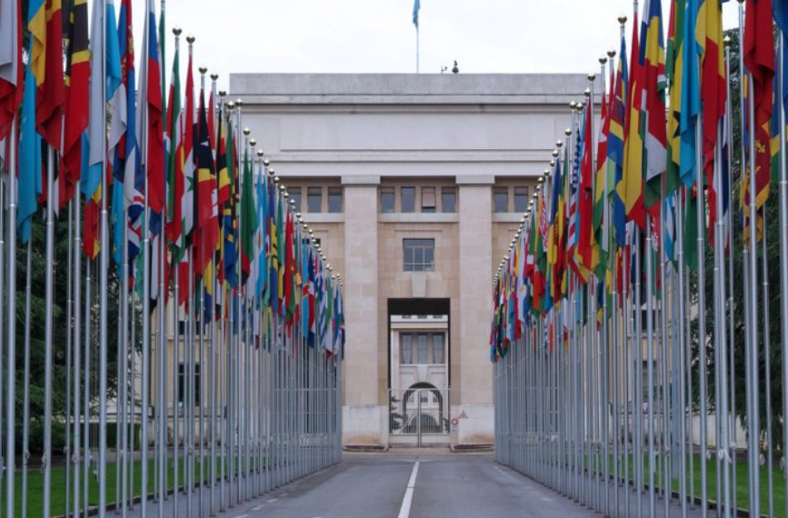 Аллея флагов у Дворца Наций или дворца ООН в парке Ариана