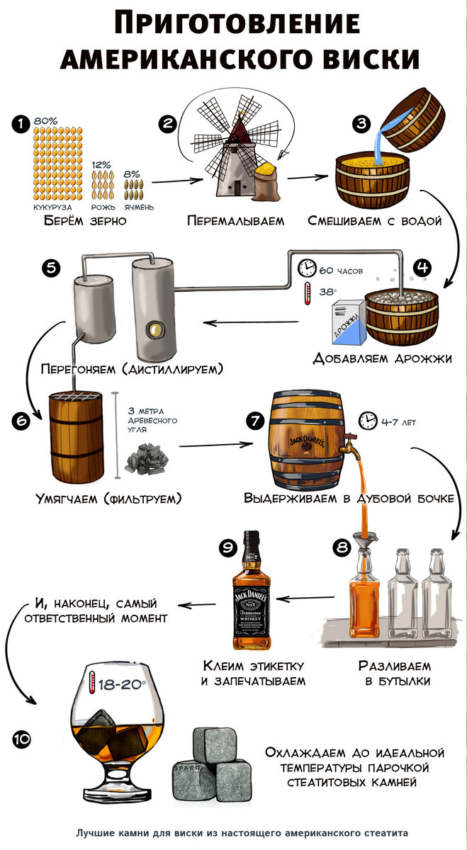 Главное отличие американского виски в том, что в его основе, как правило, кукуруза, и чуть реже — рожь, а соложеный ячмень играет лишь вспомогательную роль и составляет всего 5–10% зерновой смеси. Кукурузу и рожь при этом не солодят. Хотя одна очень маленькая винокурня в Сан-Франциско делает сейчас в небольших количествах односолодовый ржаной виски Old Potrero. Не происходит при производстве американского виски и просушки солода на торфяном дыму. Первая дистилляция, как правило, проходит в колонне непрерывного цикла (до 80-х годов прошлого века в основном ею и ограничивались), а вторая — в подобии перегонного куба: thumper или doubler (вторичная перегонка в кубах почти не повышает крепости дистиллята, а лишь дополнительно очищает его, меняя вкус). Но есть и приятные исключения: винокурня Woodford Reserve в Кентукки для производства своего бурбона использует только медные перегонные кубы (произведенные по заказу в Шотландии). К тому же это единственный виски