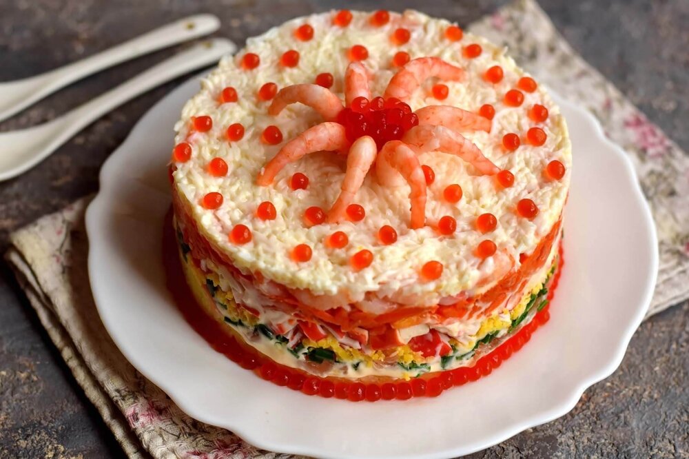 Рецепт красивого, праздничного, богатого и очень вкусного салат «Царская шуба». Салат получается очень нежным, имеет выраженный вкус морепродуктов. Из морепродуктов в его состав сходят креветки, красная рыба, крабовые палочки и красная икра. Кроме отменного вкуса и великолепного внешнего вида, салат отличается высокой пользой. Блюдо можно готовить на каждый праздник, и оно вам никогда не надоест. Ингредиенты: Приготовление: Клубни картофеля отварите в кожуре до готовности, полностью остудите, очистите, натрите на крупной терке. На плоскую тарелку установите формовочное кольцо, блюдо слегка смажьте майонезом. Для данного количества продуктов подойдет форма диаметром 20 см. Нижним слоем выложите картофельную стружку, посолите, смажьте майонезом. Красную рыбу нарежьте кубиками или пластинками, выложите на картофельный слой. Зеленый лук нарежьте, присыпьте ими слабосоленую рыбу. Сверху сделайте густую сетку из майонеза. Яйца заранее отварите «вкрутую», отделите белки от желтков. Желтки изм