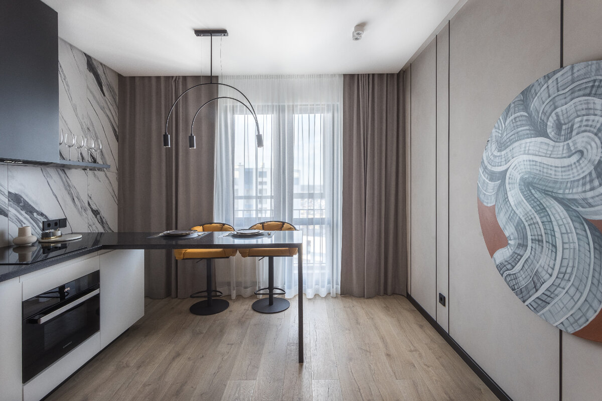 В очередном выпуске рубрики «Квартира недели» — однокомнатная квартира для временного пребывания сотрудников компании. Дизайнеры Валентина Ошуркова и Елена Киприянова сделали ремонт за три месяца и создали контрастное пространство с новым зонированием без сложных строительных манипуляций. Изначально квартиру приобрели с ремонтом от застройщика: на полу лежал ламинат, на стенах — белые обои под покраску. В оригинальной планировке были объединены кухня и гостиная, но дизайнеры разделили их на два изолированных пространства. Так как квартира создана для временного пребывания и не рассчитана для приема гостей, то гостиная стала также спальней, а небольшое продолжение кухонного гарнитура — обеденной зоной. Вся работа с цветом была основана на контрасте нейтрального фона и ярких пятен. В интерьере использованы сложные оттенки на акцентах, например, терракотовые шторы и подушки, оранжевые полубарные стулья, синие светильники, необычные бра и керамогранит с рисунком. Нажмите, чтобы смотреть бо