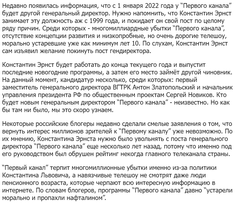 На Первом Канале произойдут огромные перемены. К чему привело увольнение Константина Эрнста. И за что его уволили?