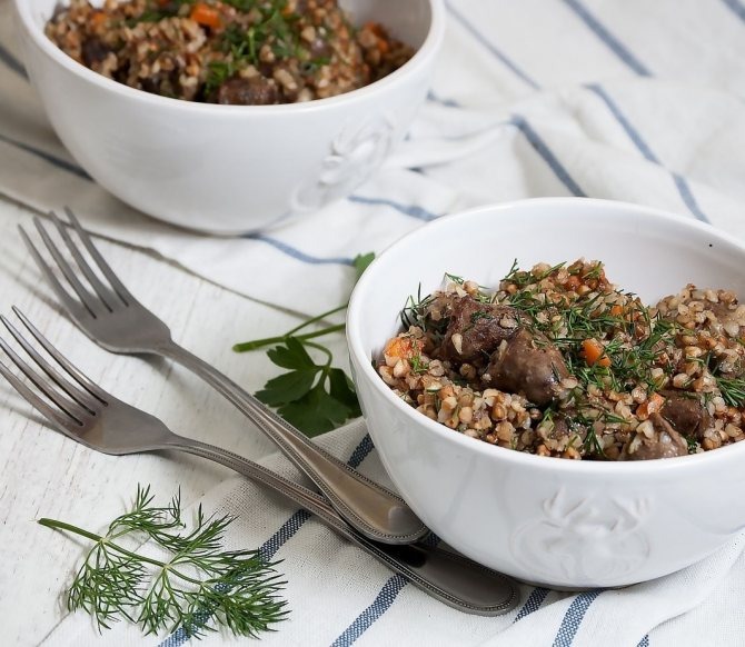 - Приготовленные в мультиварке куриные сердечки с гречкой понравятся и взрослым, и детям.