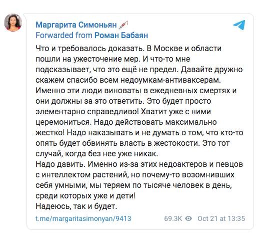 https://kubnews.ru/obshchestvo/2021/10/21/iz-za-vas-mogut-umeret-moi-deti-margarita-simonyan-zhestko-vyskazalas-ob-antiprivivochnikakh/Она предала родственников, друзей и коллег.