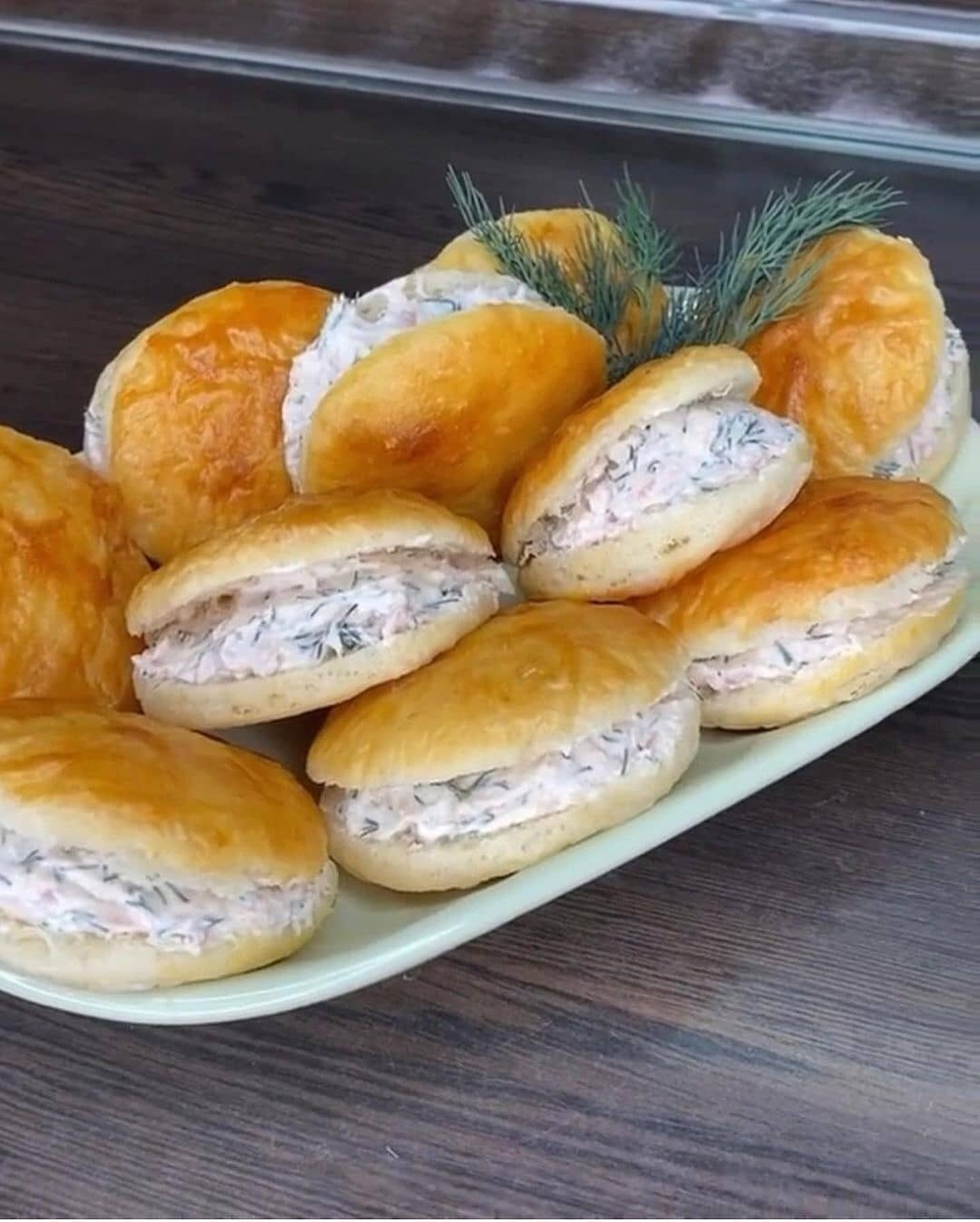 Ингредиенты: 🔸 500 гр. слоеного дрожжевого теста 🔸 1 яйцо Начинка по желанию, можно взять любую слабо соленую или консервированную рыбку 🔸 140 гр. творожного сыра 🔸 укроп 🔸 филе трески 🔸 1 ст. л. сметаны Приготовление: Готовое слоеное дрожжевое тесто припыляем мукой, слегка раскатываем и вырезаем кружочки. Смазываем их взбитым яйцом и отправляем в разогретую до 180° духовку примерно на 20 минут. Пока заготовки немного остынут, готовим начинку. Разрезаем заготовки из теста не до конца и начиняем их. Приятного аппетита! 👍