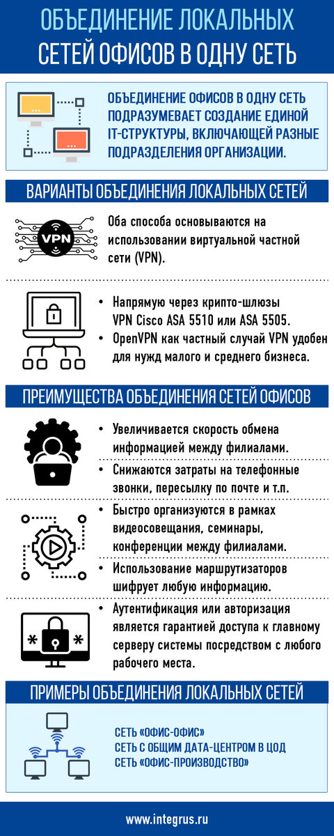 Возросшие скорости бизнес-процессов делают необходимым быстрый обмен информационными ресурсами и работу с оргтехникой. Для этого разрозненные филиалы или подразделения объединяются с головным офисом в единую локальную сеть. Общая IT-структура увеличивает производительность труда, усиливает безопасность передаваемых данных. Объединить локальные сети в единую можно двумя способами, с использованием VPN. Внутри имеющейся рабочей сети создается новая, заменяющая при подключении к себе IP-адрес пользователя данными VPN. Такое соединение отличается высокой степенью защищенности, передаваемая информация шифруется за счет использования изменяющихся ключей. Пять туннельных протоколов (PPTP, L2TP, IPSec, SSTP, OpenVPN) обладают разной степенью защиты и скоростными параметрами. На практике ВПН-сервисами чаще всего используется протокол с открытым исходным кодом – OpenVPN. Благодаря стороннему ПО, он может быть реализован для любой платформы. Важное преимущество объединения локальных сетей офисов