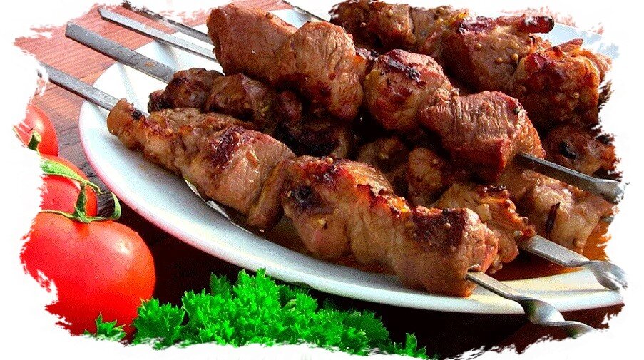 Шашлык из свинины. Свинина 110, уксус 10, лук репчатый и зеленый 40, сало свиное 10, гарнир 150, перец красный молотый, зелень, соль. Лучше всего для этого шашлыка используют мякоть задней ноги или лопатки, срезав лишний жир и оставив его слоем не более 7–8 мм. Мясо нарезают небольшими кусками, складывают в посуду, солят, посыпают молотым перцем, добавляют мелко нарезанный репчатый лук, уксус или лимонный сок и перемешивают. Посуду накрывают крышкой и на 2–3 часа помещают в холодное место для маринования. Затем куски мяса нанизывают на металлический вертел вперемешку с репчатым луком, нарезанным кольцами. Жарят шашлык на мангале над горячими без пламени углями 15–20 минут, поворачивая вертел так, чтобы мясо равномерно прожарилось . Если нет мангала, то шашлык можно жарить в электрогриле или на сковороде.. Подают с рассыпчатой рисовой кашей и поджаренным луком или без риса с сырым репчатым и зеленым луком, помидорами и лимоном. Шашлык из говядины с рисом. Говядина 160, сало-шпик 40, са
