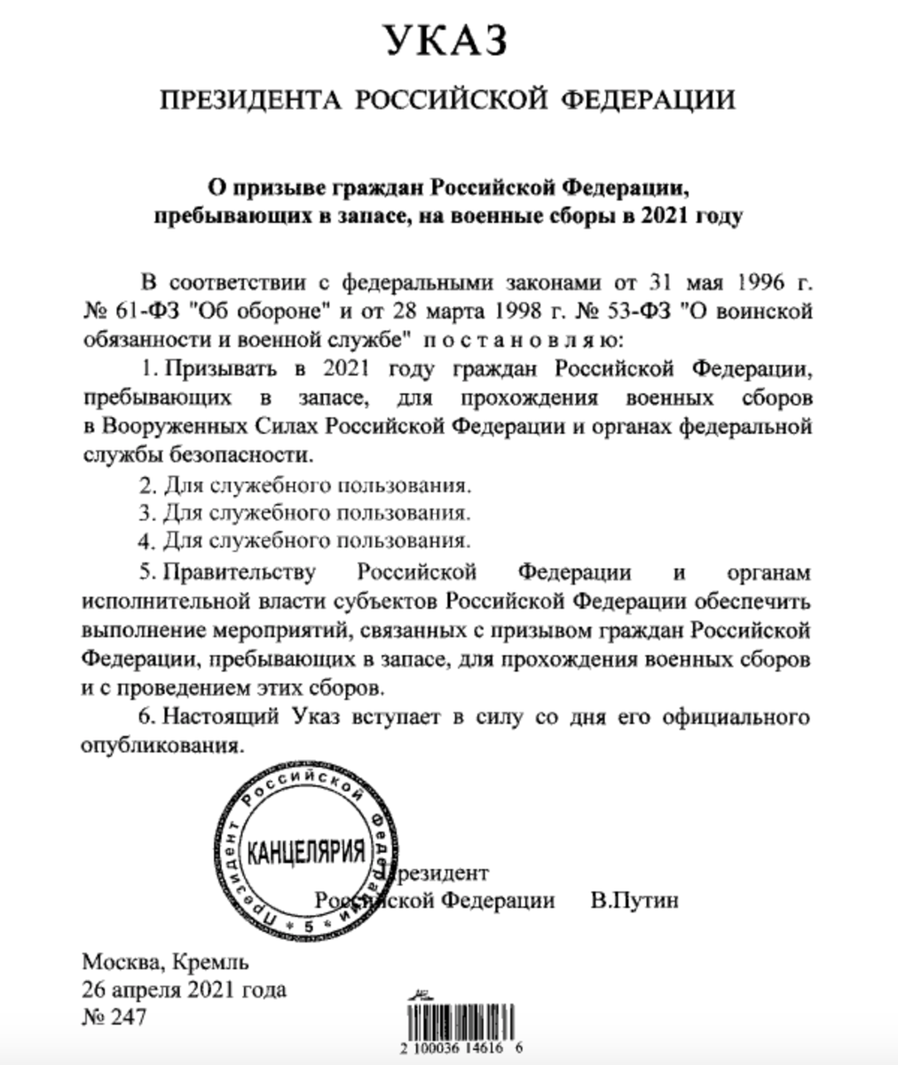 Этот призыв, призыв обычных запасников, происходит каждый год. Каждый год Президент издаёт указ, в котором содержится норма, обязывающая произвести военные сборы. Вот так выглядел указ в 2021 году.