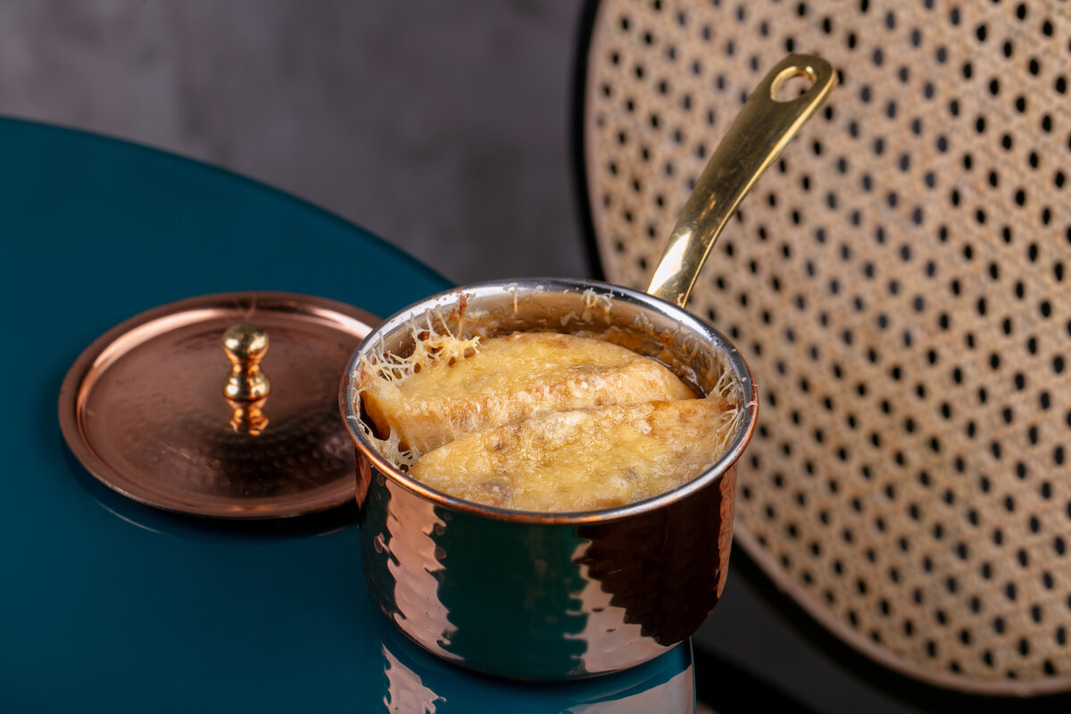 - Разлить по формочкам или горшочкам. Выложить обжаренный багет, сверху посыпать натертый пармезан и запекать 10-15 минут до подрумянивания сыра.