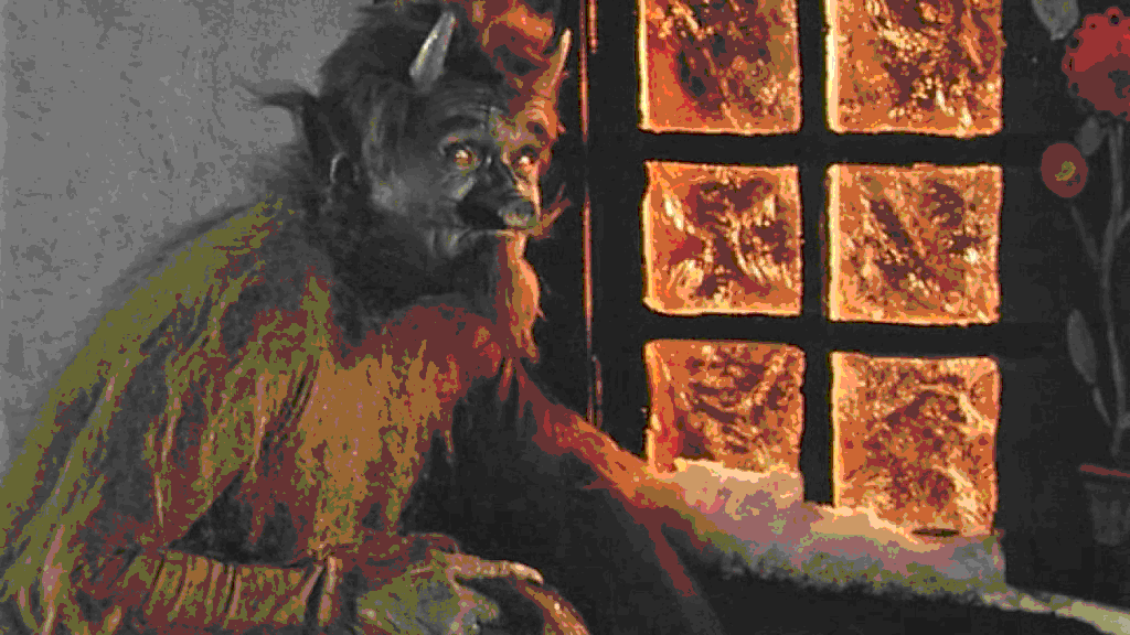 А в окно стучали черт и чудовище. Черт был черный, на лбу рожки и с пятаком, как у свиньи, вместо носа и танцевал с длинным своим хвостом.