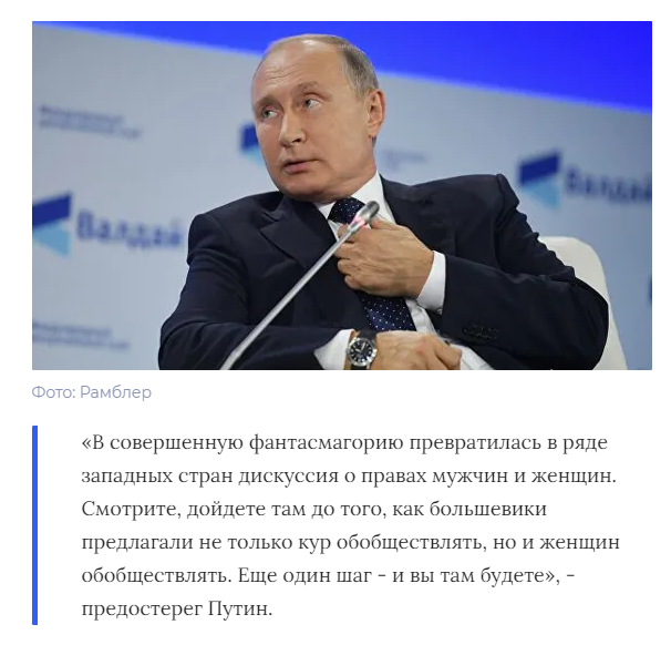 Ну а на этот раз речь идёт про "сексуальную распущенность и обобществление женщин" при злобных орках большевиках, которые президентом были поданы на Валдайском форуме, как общеизвестный факт. Хорошо бы выяснить, откуда у этой информации растут? Ведь не придумал же её президент. Тем более, что об этом он говорит не впервой. Ну, а что? Получается, как с галошами, которые в СССР только и могли делать для Африки, чтобы по песку ходить. Разве нет? А всякие ракеты, полёты в космос, самолёты и прочие тракторы нам сняли в Голливуде в соседнем павильоне со съёмками полётов американцев на Луну. К слову мне понятен праведный гнев президента по поводу западных трансгуманитарных заморочек. Сам в шоке. Ну а теперь давайте рассмотрим откуда ноги растут у мифа что большевики якобы всех женщин обобществляли.