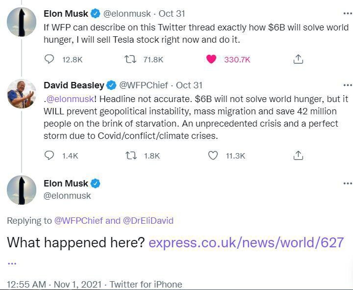 Маск ответил, что готовь отдать деньги, если ООН предоставит ему чистый план действий в решении мирового голода, на что ООН не согласился и продолжил давить. В ответ Маск закинул статью с заголовком "ДЕВЯТИЛЕТНИЕ ДЕТИ ВЫНУЖДЕНЫ С****ь ПРЕДСТАВИТЕЛЯМ ООН ЗА ЕДУ".