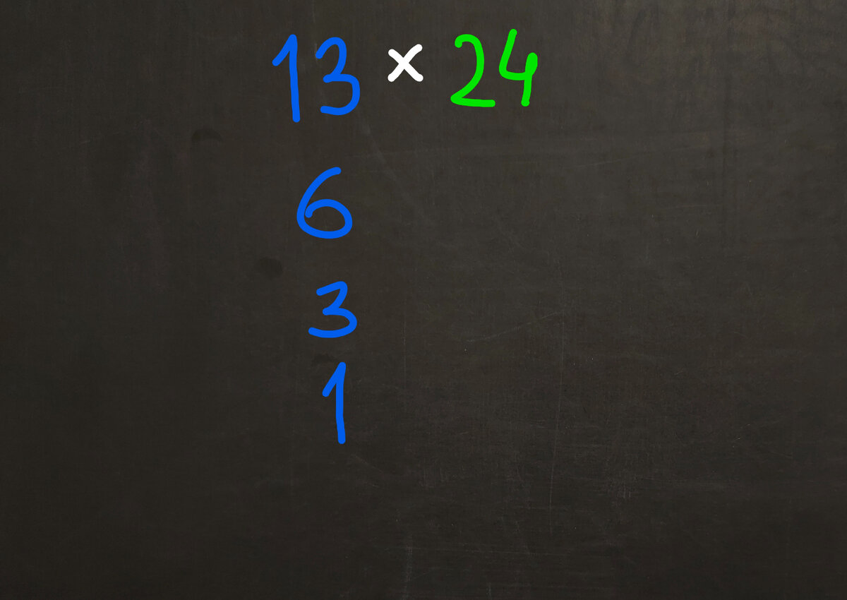 Самое интересное, что для того, чтобы перемножить два натуральных числа, нам не нужно знать таблицу умножения и уметь умножать столбик. Метод состоит из четырех шагов. Давайте разберем их сразу на примере. Умножим 13 на 24.