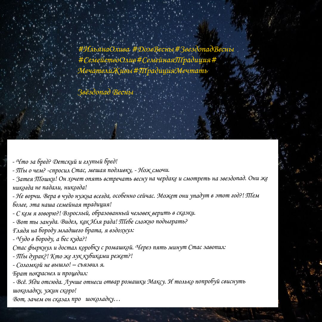 - Затея Тошки! Он хочет опять встречать весну на чердаке и смотреть на звездопад. Они же никогда не падали, никогда!