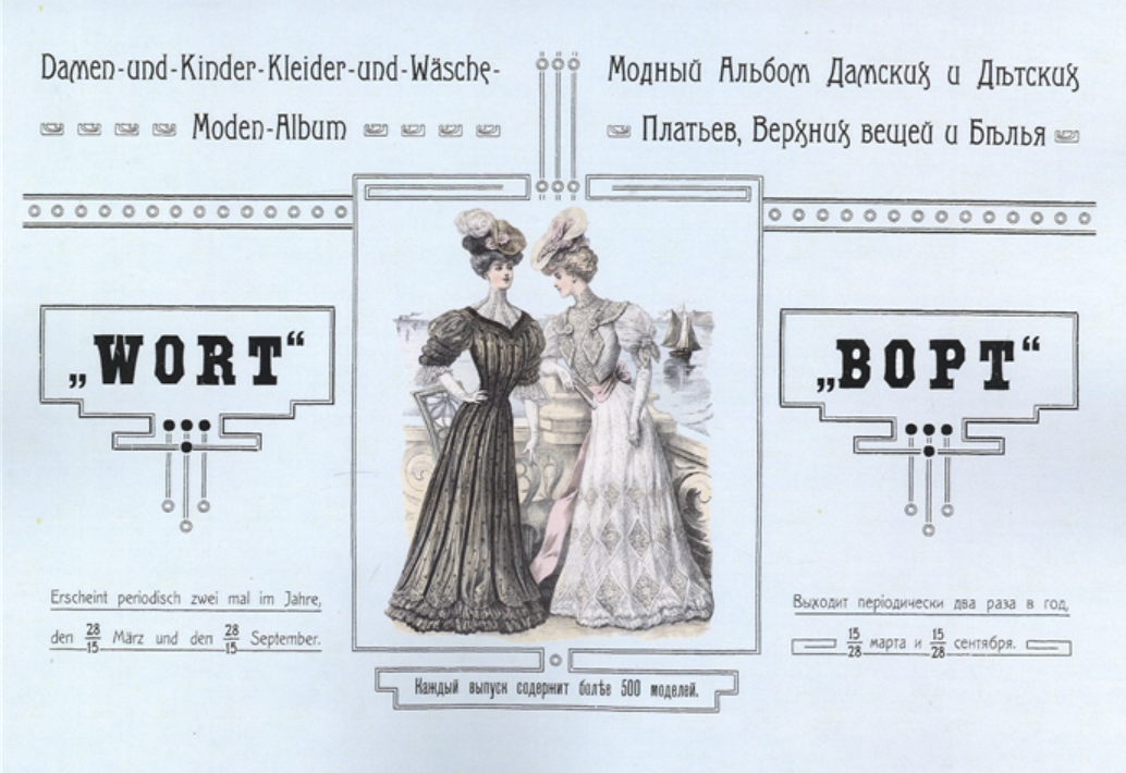 "Wort / Ворт" Немецкий модный альбом дамских и детских платьев, верхних вещей и белья выходил периодически два раза в год в марте и сентябре. Каждый выпуск содержит более 500 моделей. ХРОНИКА МОДЪ Предетоящіе сезоны не представляютъ особеннаго измѣненія въ туалетахъ, развѣ только можно отмѣтить пользующіеся большимъ успехомъ костюмы тейоръ. Фабриканты поспѣшили загромоздить рынокъ богатѣйшимъ выборомъ матерій, среди которыхъ бросаются въ глаза клѣтчатыя матеріи для костюмовъ, шелкъ въ полоскахъ, бархатъ и тафта для нарядныхъ туалетовъ. Фасоны въ общемъ сохраняютъ самый простой покрой, причемъ болѣе или менѣе нарядные платья отделываются кружевами и гипюромъ. На нарядныя платья больше всего пойдетъ блестящая тафта всевозможныхъ не яркихъ оттѣнковъ, близкихъ къ цвѣту охры. Много отдѣлокъ бантиками изъ чернаго бархата, какъ на юбкахъ, такъ и на лифахъ. Лифы въ большинствѣ дѣлаются съ бертами, т.е. вырѣзанныя пелеринки, которыя скрещиваются на груди изъ вышитой тафты съ кружевомъ и