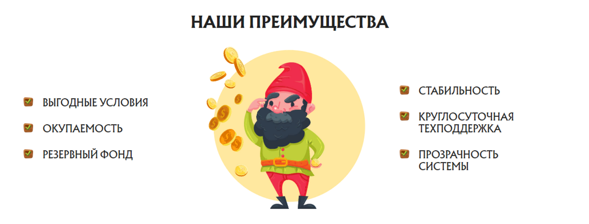 Доброго времени суток, друзья ! Сегодня распишу вам схему, по которой можно заработать денежку, с полного нуля! Да да, зарабатывать мы будем играюче! Сегодня я решил поделится с вами моей историей, началась которая около 4 месяцев назад. Я никогда не верил что можно заработать на каких-то играх, тем более похожих на пирамиду. Но в один день случайно попал в игру, которая называется Golden Mines Суть игры крайне проста и описывается следующей картинкой: А самое интересное, что вам практически не нужно уделять ей времени, потому что гномы будут сами добывать руду. Вам нужно лишь изредко заходить и продавать ее, фиксируя свой доход. Процесс регистрации и получения начальных монет Для начала нужно перейти по ссылке - Tут и пройти регистрацию После подтверждения почты вы сможете зайти в аккаунт. При входе вы переходите ваш личный кабинет, где будет указана ваши данные и статистика. Ниже будет информация о нанятых вами гномах: Как купить первого гнома С регистрацией закончили, теперь давай