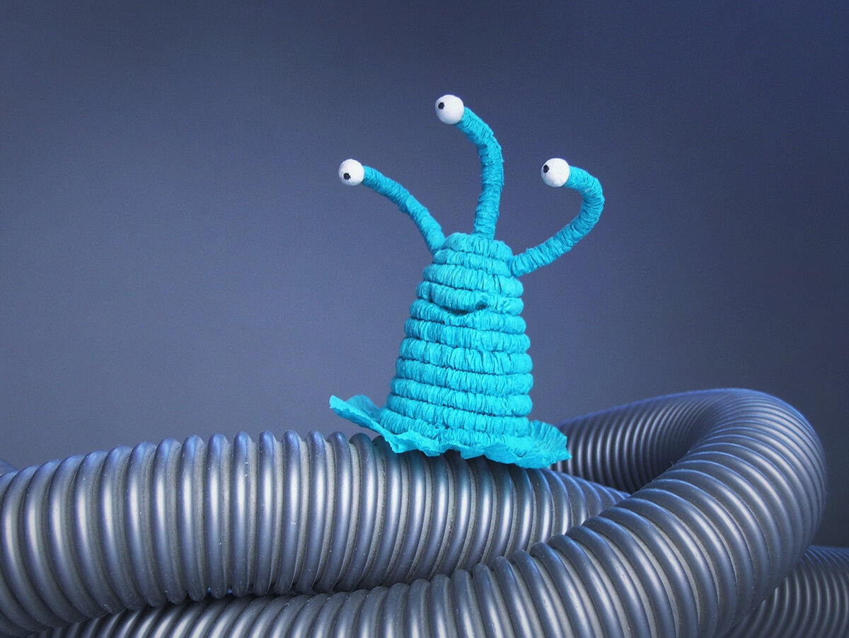 Недавно на Землю опустился летательный аппарат с планеты Gaufrer. С командиром и бортинженером мы уже познакомились. Теперь расскажем про первого пилота-исследователя. Он не терял даром время, сразу начал осматривать поверхности. Мы сделаем такого же из гофробумаги и салфеток. Нам понадобятся 2 салфетки, 5 гофротрубочек, три квадратика из белой гофробумаги размером 5х5 см и три проволочки длиной 6 см. Как скручивать гофротрубочки, можно посмотреть здесь. Сделаем основу - развернём одну салфетку и скатаем шарик, а потом прокатаем его в ладошках, чтобы получилась продолговатая форма. Другой салфеткой обернём форму и подклеим снизу. Приклеим к основе первую гофротрубочку, отступив 0,5 см снизу. Оклеим гофротрубочками всю основу. Сверху используем одинарные трубочки. Разрежем гофротрубочку по бороздке и немного развернём её, чтобы получить рюшечку-оборочку. Приклеим рюшечку-оборочку снизу. Шилом сделаем три отверстия, подготовим три проволочки и три гофротрубочки. Капнем клея в отверстия