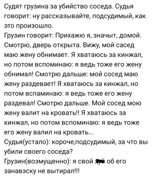 1. - У вас тараканы есть в доме? - Не-а, их пауки съели. - У вас есть пауки? - Неее, их крысы съели. - У вас есть крысы??! - Нет, их Василий Георгиевич Белов съел. - А это еще кто? - Забыл представиться... 2. Приходит друг к мужику и говорит: - Михалыч, помнишь у тебя полгода назад жена пропала? - Конечно помню. Как же забыть то? - Ну да-к вот, есть 2 новости: хорошая и плохая. С какой начать? - Ну давай с плохой.. - Мы нашли твою жену, она утонула в реке. - Ох, а какая хорошая новость? - Мы с неё ведро раков сняли 3. Деревня, профсобрание. Председатель колхоза спрашивает доярку: - Марья, расскажите по какой причине вы хотите разойтись с Николаем? - Он меня не может удовлетворить как мужчина! Из зала раздается женский голос: - Всех удовлетворяет, а её нет! Мужской голос из зала: - А её никто не может удовлетворить... 4. 5. Нашел мужик лампу, потёр её, а оттуда вылез Джин и говорит: - Я исполню 3 твоих желания. - Ну, тогда давай по рюмочке. Джин достал бутылку. Посидели выпили. Через ча