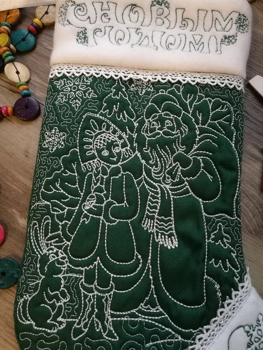 Вы наверно заметили, что на Новый год нас все больше окружают изображения Санты, а не нашего родного Деда Мороза. Я поискала картинки в инете и по ним создала дизайн машинной вышивки новогоднего валенка (сапожка). Процесс вышивки и сборки очень прост. Давайте рассмотрим его в картинках. 1. Запяливаем стабилизатор для вышивки в пяльца и пришиваем к нему наполнитель для стежки (синтепон, слимтекс, тонкий ватин или ваш вариант для объемной стежки). 2. Сверху укладываем ткань и пристрачиваем. Сразу можно не обрезать или обрезать с припуском на швы 1см. Далее позволяем машинке работать за нас, то есть вышиваем и стегаем. И так все три части нашего валенка. 3. Сшиваем все элементы между собой и отглаживаем. По готовой лицевой части выкраиваем заднюю часть и детали подкладки. 4. Сшиваем между собой две детали валенка и отдельно две детали детали подкладки (в подкладке оставляем дырочку для выворачивания). 5. Дальше сшиваем верх основной части и подкладки не забыв вста