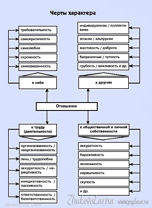 Характер трактуется в психологии далеко не однозначно. Существуют трудности в различении темперамента и характера. Еще больше спорных вопросов возникает при попытке развести понятия «характер» и «личность». Характер – это совокупность индивидуальных устойчивых психических особенностей человека, проявляющихся в его поведении, деятельности и общении. Характер базируется на темпераменте. Формируется характер воспитанием на основе врожденных свойств. Характер (греч. Charakter – отличительная черта) – структура стойких, сравнительно постоянных психических свойств, определяющих особенности отношений и поведения личности. Статику характера определяет тип нервной деятельности, а его динамику –окружающая среда. Характер начинает формироваться с первых месяцев жизни. Основная роль в этом принадлежит общению с окружающими людьми. В поступках и формах поведения ребенок подражает своим близким. При помощи прямого обучения через подражание и эмоциональное подкрепление он усваивает формы поведения вз