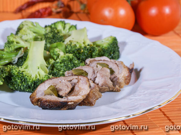 Рулетики из свинины с маринованными огурцами готовят в 2 этапа - сначала мясо с начинкой обжаривают до корочки, после держат под крышкой на небольшом огне до готовности. В этом случае мясо останется сочным, с хрустящими маринованными огурчиками внутри. Рецепт приготовления: Шаг 01 Ломтики свиной шейки хорошо отбить, чтобы толщина мяса была в несколько мм. Удобнее отбивать мясо через пленку, чтобы сохранялась целостность кусочка мяса. Каждый ломтик присолить и смазать тонким слоем горчицы. Шаг 02 Каждый огурец разрезать на 4-6 полосок. На край каждого кусочка мяса положить по 2-3 полоски огурца и свернуть рулетом. Шаг 03 Если ломтики сала были слишком толстые, то и их немного отбить. Обернуть салом каждый мясной рулет и скрепить зубочисткой. Шаг 04 Разогреть сковороду, обжарить до корочки каждый рулетик. Уменьшить огонь и довести рулеты до готовности под крышкой. Готовые рулеты нарезать наискосок, ломтики разложить на тарелке и подать с отварными или свежими овощами. Для рецепта вам пот