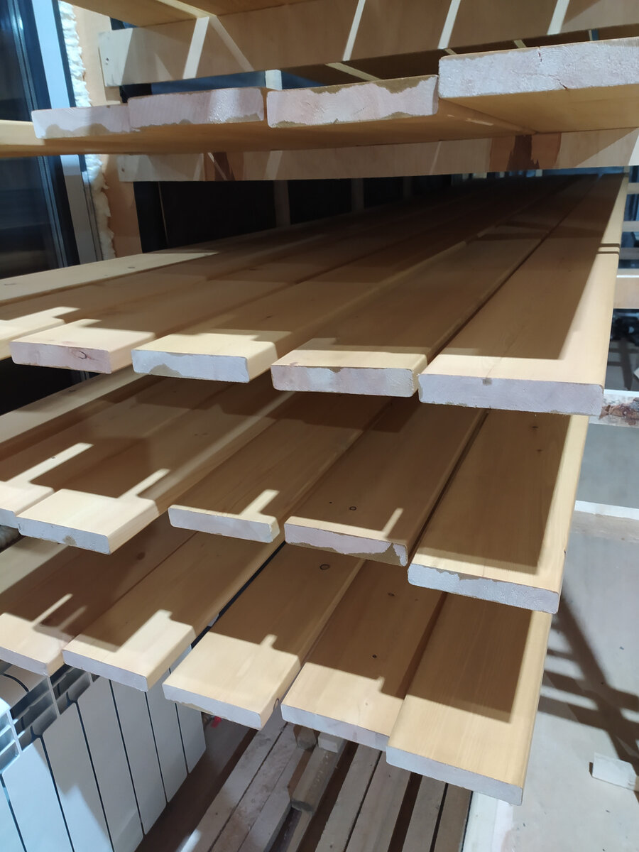 Здравствуйте! Очередная статья со стройки каркасного кафе в тайге за Междуреченском. В прошлый раз смонтировали потолок на веранде, подошла очередь и для пола. Все отшлифовано, все покрашено террасным маслом от компании Тиккурила. В общем все готово для монтажа. Помните фасад здания из лиственничного планкена, а на пол взяли террасную доску из сосны, спорное решение, но заказчик так решил. Смонтируем. Выравнивающие лаги тоже не ставили, все монтируется по существующим. Хотя они и не сильно кривые, выравнивали как могли, но качество пиломатериала, плюс минус сантиметр по ширине. Критичного ничего нет, не знающий не поймет, а заказчик в курсе. Между планками оставляли зазор в пять миллиметров, крепили на желтые саморезы. Предлагали заказчику крепить на скрытый крепеж, кляммеры Твин мини, отказался, так что крепим внаглую, прямо через лицевую часть, два, один, два, один. Постарались подпорные столбы обойти так, что бы не пришлось потом городить какие то плинтусочки, ил